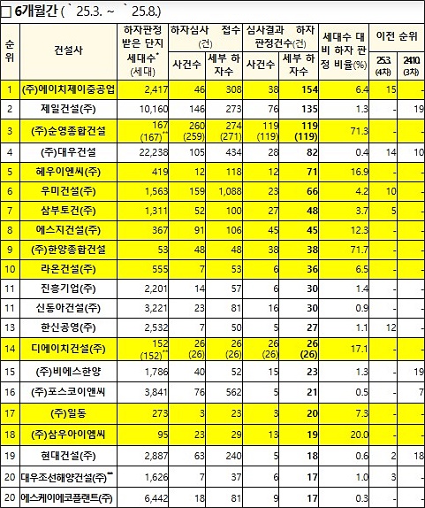 ÇÏÀÚÆÇÁ¤°Ç¼ö »óÀ§ °Ç¼³»ç´Â, ÃÖ±Ù 6°³¿ù(2025.3.~2025.8.)À» ±âÁØÀ¸·Î ÇÏÀÚÆÇÁ¤ °Ç¼ö°¡ ¸¹Àº °Ç¼³»ç·Î (ÁÖ)¿¡ÀÌÄ¡Á¦ÀÌÁß°ø¾÷(154°Ç, ¼¼ºÎ ÇÏÀÚ¼ö ±âÁØ), Á¦ÀϰǼ³(ÁÖ)(135°Ç), (ÁÖ)¼ø¿µÁ¾ÇհǼ³(119°Ç), (ÁÖ)´ë¿ì°Ç¼³(82°Ç), Çý¿ìÀÌ¿£¾¾(ÁÖ)(71°Ç) ¼øÀ¸·Î ³ªÅ¸³µ´Ù.