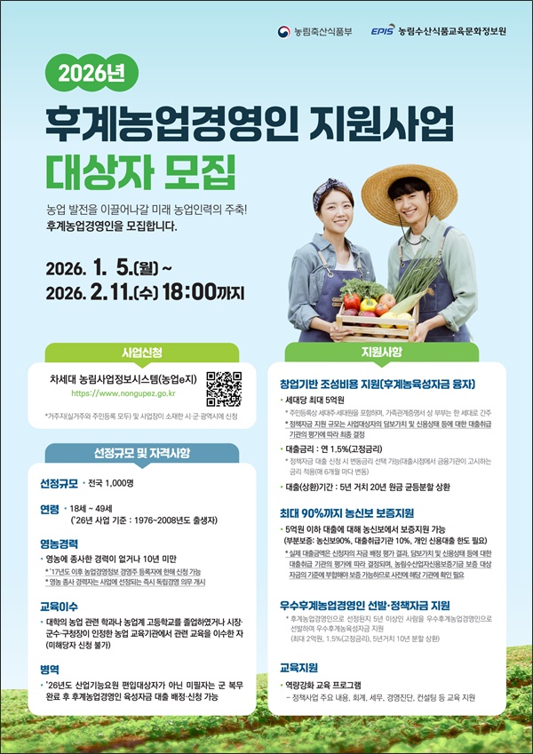 'Èİè³ó¾÷°æ¿µÀÎ À°¼º»ç¾÷'Àº ³ó¾÷ ¹ßÀüÀ» À̲ø¾î°¥ À¯¸ÁÇÑ ¿¹ºñ ³ó¾÷Àΰú ³ó¾÷°æ¿µÀÎÀ» ¹ß±¼ÇØ ÀÏÁ¤ ±â°£ Àڱݡ¤±³À°¡¤ÄÁ¼³ÆÃ µîÀ» Á¾ÇÕÀûÀ¸·Î Áö¿øÇÔÀ¸·Î½á Á¤¿¹ ³ó¾÷ ÀηÂÀ¸·Î À°¼ºÇÏ´Â »ç¾÷ÀÌ´Ù.