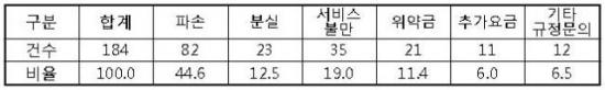 Áö³­ 2011³â 1¿ùºÎÅÍ ÀÌ»ç ¼­ºñ½º¿Í °ü·ÃÇØ Á¢¼öµÈ »ó´ã°Ç¼ö 184°ÇÀ» À¯Çüº°·Î ºÐ¼®ÇÑ °á°ú 'À̻繰ǰ ÆÄ¼Õ'ÀÌ 82°Ç(44.6%)À¸·Î °¡Àå ¸¹¾Ò°í, '¼­ºñ½º¿¡ ´ëÇÑ ºÒ¸¸'ÀÌ 35°Ç(19.0%), 'À̻繰ǰ ºÐ½Ç' 23°Ç(12.5%), 'ÇØ¾à¿¡ µû¸¥ À§¾à±ÝºÐÀï' 21°Ç(11.4%) µîÀÇ ¼øÀ̾úÀ¸¸ç, 'Ãß°¡¿ä±Ý ¿ä±¸'µµ 11°Ç(6.0%)ÀÌ Á¢¼öµÆ´Ù.