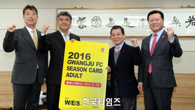 °ø½ÄÀûÀ¸·Î ±¤ÁÖFC 1È£ ½ÃÁð±Ç ±¸¸ÅÀÚ°¡ µÈ À±ÀåÇö ½ÃÀåÀº "Áö³ ½ÃÁð ¾î·Á¿î ȯ°æ ¼Ó¿¡¼µµ ±¤ÁֽùεéÀ» À§ÇØ º¸¿©ÁØ ÅõÈ¥¿¡ ¹Ú¼ö¸¦ º¸³½´Ù. ¿Ã ½ÃÁ𠿪½Ã ¸ðµÎ°¡ ´õºÒ¾î ±¤ÁÖFCÀÇ È°¾àÀ» ÀÀ¿øÇϰڴÙ"°í ÀÀ¿øÀÇ ¸Þ¼¼Áö¸¦ Àü´ÞÇÑ µÚ ´ÙÀ½ ±¸¸ÅÀÚ·Î Á¶¿µÇ¥ ±¤ÁÖ½ÃÀÇ¿Ü ÀÇÀå°ú Á¤¿øÁÖ ±¤ÁÖFC ´ëÇ¥À̻縦 Áö¸ñÇß´Ù.