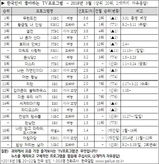 Çѱ¹°¶·´ÀÌ 3¿ù20~22ÀÏ »çÈê°£ Àü±¹ ¸¸ 19¼¼ ÀÌ»ó ³²³à 1,003¸í¿¡°Ô ¿äÁò °¡Àå Áñ°Üº¸´Â TVÇÁ·Î±×·¥À» ¹°Àº °á°ú(2°³±îÁö ÀÚÀ¯ÀÀ´ä), '¹«ÇѵµÀü'ÀÌ ¼±È£µµ 5.6%·Î 6°³¿ù ¸¸¿¡ ´Ù½Ã 1À§¸¦ Â÷ÁöÇÑ °ÍÀ¸·Î Á¶»çµÆ´Ù.