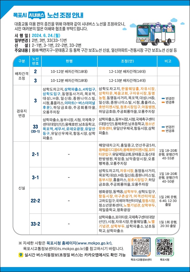 ÀÌ¿Í ÇÔ²² ¹ö½º ¿îÇàÀÇ È¿À²¼ºÀ» ³ôÀ̱â À§ÇØ °£¼±3¹øÀÇ »ïÇÐÆÄÃâ¼Ò~»ïÇеµÀÔ±¸ ±¸°£À» ÇÑ¿ï¿þµùȦ~ÀÚÀ¯½ÃÀåÀ¸·Î, ¹ö½ºÅ͹̳Î~À̸¶Æ® ±¸°£À» ¹ö½ºÅ͹̳Î~ûȣ½ÃÀåÀÔ±¸·Î º¯°æÇϸç, ³¶¸¸33(33-1)¹øÀÇ ¸ñÆ÷¿ª~¸ñÆ÷¼¼¹«¼ ±¸°£À» û¼Ò³â¹®È¼¾ÅÍ·Î º¯°æÇÏ´Â µî ³ë¼±À» ÀϺΠÁ¶Á¤ÇÑ´Ù.