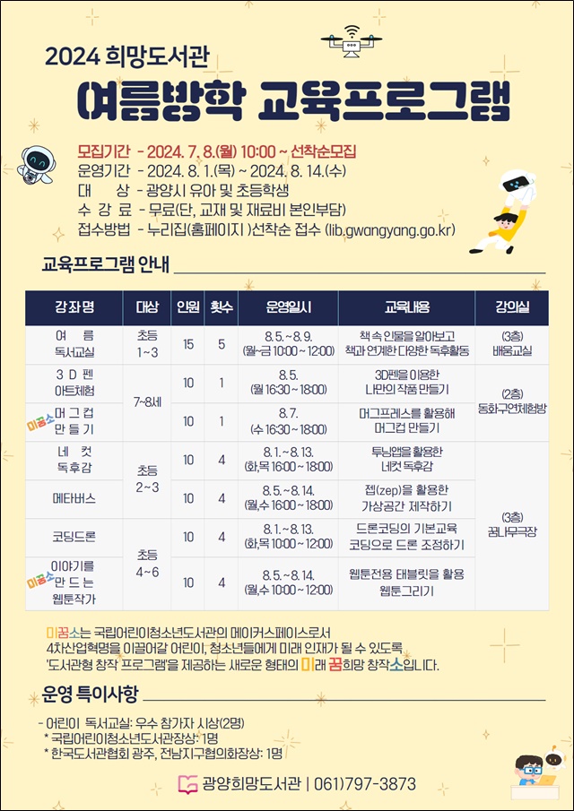 ¿©¸§¹æÇÐ ÇÁ·Î±×·¥¿¡´Â 7~8¼¼¸¦ À§ÇÑ '3DÆæ ¾ÆÆ®Ã¼Çè', '¸Ó±×ÄÅ ¸¸µé±â'¿Í Ãʵî1~3ÇгâÀ» À§ÇÑ '¿©¸§µ¶¼±³½Ç', Ãʵî2~3ÇгâÀ» À§ÇÑ '³× ÄÆ µ¶Èݨ', '¸ÞŸ¹ö½º', Ãʵî4~6ÇгâÀ» À§ÇÑ 'ÄÚµù µå·Ð', 'À̾߱⸦ ¸¸µå´Â À¥Å÷ÀÛ°¡' µî 7°³ °Á°¡ ¿î¿µµÈ´Ù.