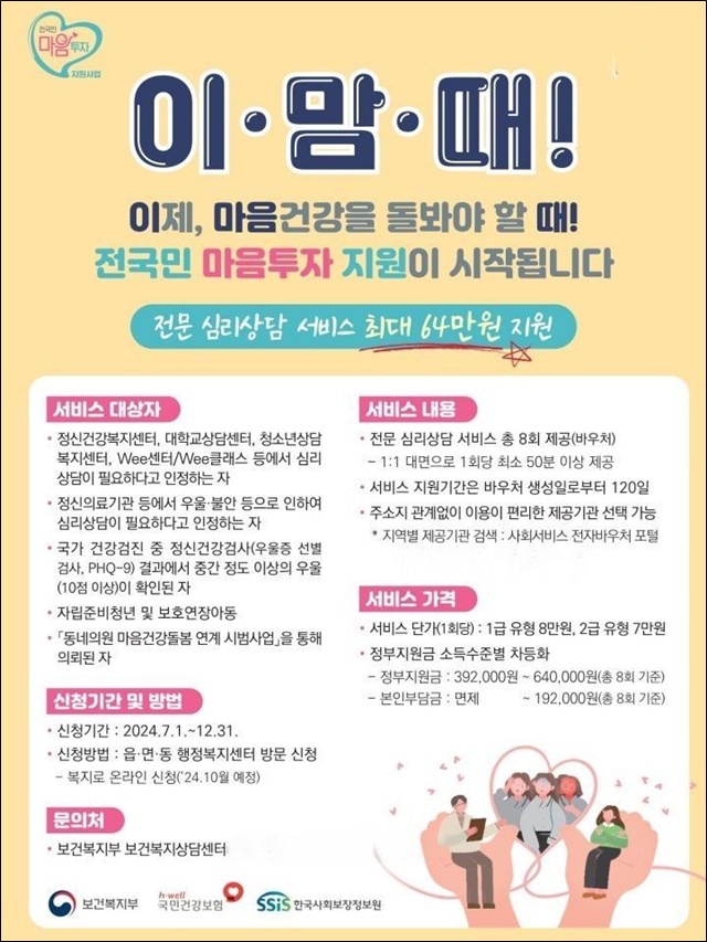 Áö¿ø ´ë»óÀº Á¤½Å°Ç°º¹Áö¼¾ÅÍ, Wee¼¾ÅÍ(Ŭ·¡½º), ´ëÇб³»ó´ã¼¾ÅÍ, Á¤½ÅÀÇ·á±â°ü µî¿¡¼ '½É¸®»ó´ãÀÌ ÇÊ¿äÇÏ´Ù°í ÀÎÁ¤µÇ´Â ÀÚ', ±¹°¡°Ç°°ËÁø¿¡¼ 'Áß°£ Á¤µµ ÀÌ»óÀÇ ¿ì¿ïÀÌ È®ÀÎµÈ ÀÚ' µîÀ̸ç, ´ë»óÀÚ¿¡°Ô ÃÑ 8ȸÀÇ Àü¹® ½É¸®»ó´ã ¼ºñ½º ÀÌ¿ë ¹Ù¿ìó¸¦ Á¦°øÇÑ´Ù.
