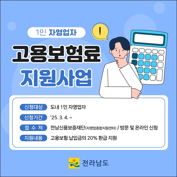 »ç¾÷ ´ë»óÀº Àü³²¿¡¼ °í¿ëº¸Çè¿¡ °¡ÀÔÇÑ 1ÀÎ ÀÚ¿µ¾÷ÀÚ´Ù. ¸Å¿ù ³³ÀÔÇÏ´Â °í¿ëº¸Çè·áÀÇ 20%¸¦ ÃÖ´ë 3³â ȯ±Þ Áö¿øÇÑ´Ù. °í¿ëº¸Çè µî±Þ¿¡ µû¶ó ¿ù 8õ190¿ø¿¡¼ 1¸¸5õ210¿ø±îÁö Â÷µî Áö±Þ, ¿¬°£ ÃÖ´ë 18¸¸2õ520¿øÀ» ȯ±ÞÇØÁØ´Ù.