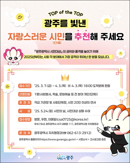 ½Ã¹Î´ë»ó Èĺ¸ÀÚ´Â ±¤Áֽà ´©¸®Áý °ø°íÀÏ(2¿ù28ÀÏ) ±âÁØ 3³â ÀÌ»ó ±¤Áֽÿ¡ °ÅÁÖÇÏ¸é¼ ±¤ÁÖ½ÃÀÇ ¸í¿¹¿Í Áö¿ª¹ßÀü¿¡ °øÀûÀÌ ÀÖ´Â »ç¶÷(´Üü)À¸·Î, °¢±Þ ±â°üÀå ¶Ç´Â »çȸ´ÜüÀå, ½Ã¹Î 20ÀÎ ÀÌ»ó ¿¬¼·Î ÃßõÇÒ ¼ö ÀÖ´Ù.