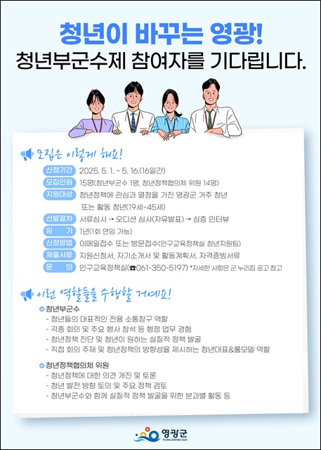 ¸ðÁý ºÐ¾ß´Â, û³â ºÎ±º¼ö 1¸í, û³âÁ¤Ã¥À§¿ø 14¸íÀ¸·Î, ¸¸ 19¼¼ºÎÅÍ 45¼¼ ÀÌÇÏÀÇ ¿µ±¤±º °ÅÁÖÀÚ ¶Ç´Â °ü³»¿¡¼ Ȱµ¿ ÁßÀΠû³âÀÌ¸é ´©±¸³ª Áö¿øÇÒ ¼ö ÀÖ´Ù. ¸ðÁý ¸¶°¨Àº ¿À´Â 5¿ù16ÀϱîÁö´Ù.