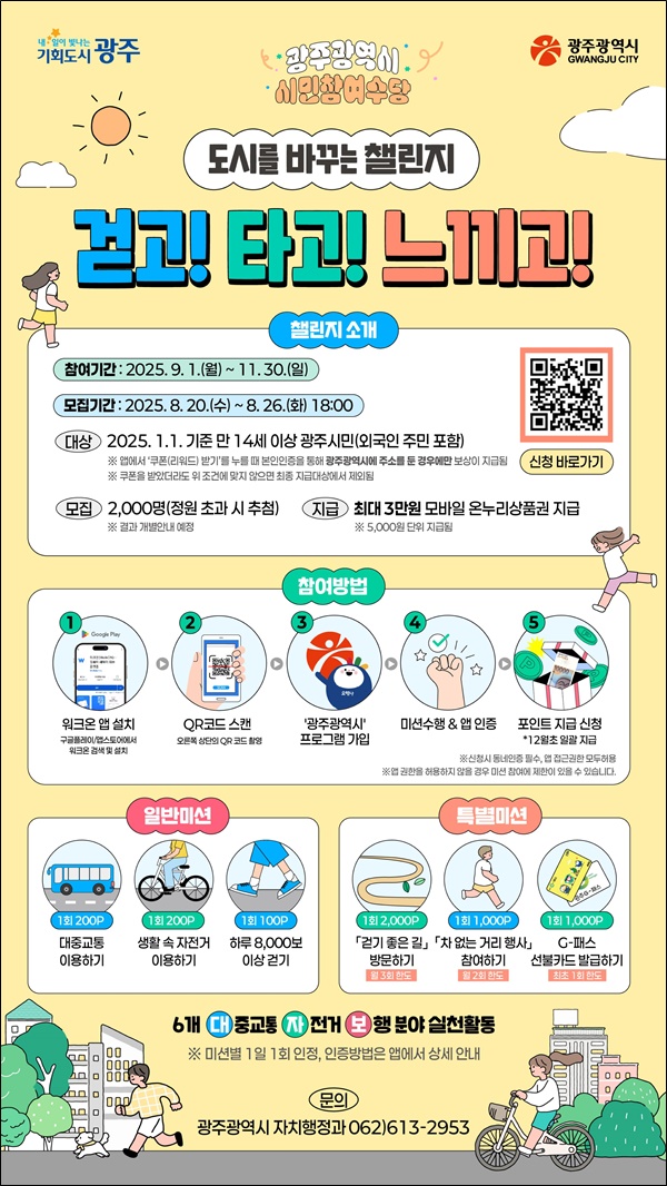 ±¤ÁÖ±¤¿ª½Ã´Â ½Ã¹ÎÀÌ ÀÏ»ó ¼Ó¿¡¼ ÀÚ¹ßÀûÀ¸·Î Âü¿©ÇÏ´Â °øÀÍȰµ¿À» Àå·ÁÇϰí, °Ç°ÇÑ µµ½Ã ¹®È¸¦ È®»êÇϱâ À§ÇØ '2025³â ½Ã¹ÎÂü¿©¼ö´ç ½Ã¹ü»ç¾÷'À» ¿À´Â 9¿ù1ÀϺÎÅÍ 11¿ù30ÀϱîÁö 3°³¿ù°£ ¿î¿µÇÑ´Ù.