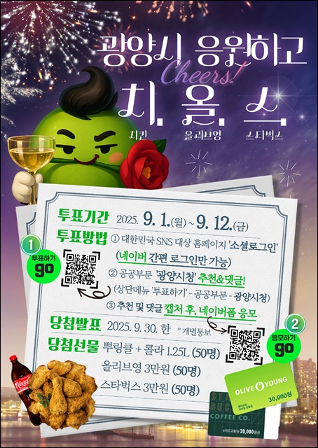 ¿Â¶óÀÎ À̺¥Æ® Âü¿© Èñ¸ÁÀڴ ȨÆäÀÌÁö(http://snsawards.com/vote2025_2/1476789)¿¡ Á¢¼ÓÇØ ³×À̹ö °£Æí ·Î±×ÀÎ ÈÄ, °ø°øºÎ¹® '±¤¾ç½Ãû' ÆäÀÌÁö¿¡ µé¾î°¡ Ãßõ ¹öưÀ» ´·¯ ÅõÇ¥Çϰí ÀÀ¿ø ´ñ±ÛÀ» ³²±ä µÚ, ÇØ´ç ȸéÀ» ĸó(½ºÅ©¸°¼¦)ÇØ ³×À̹öÆû(https://naver.me/IM4yCZRR)¿¡ Á¦ÃâÇÏ¸é µÈ´Ù.