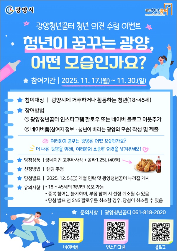 Âü¿© ´ë»óÀº ±¤¾ç½Ã¿¡ °ÅÁÖÇϰųª ±¤¾ç½Ã¿¡¼ Ȱµ¿Çϰí ÀÖ´Â 18¼¼~45¼¼ ÀÌÇÏ Ã»³âÀÌ´Ù. Âü¿© ¹æ¹ýÀº ±¤¾çû³â²ÞÅÍ °ø½Ä SNS(³×À̹ö ºí·Î±×¡¤ÀνºÅ¸±×·¥) Áß ÇÑ °÷À» ÆÈ·Î¿ìÇÑ µÚ, 'û³âÀÌ ¹Ù¶ó´Â ±¤¾çÀÇ ¸ð½À'À» ÀÚÀ¯·Ó°Ô ÀÛ¼ºÇØ ÆÈ·Î¿ì ÀÎÁõ°ú ÇÔ²² ³×À̹öÆûÀ¸·Î Á¦ÃâÇÏ¸é µÈ´Ù.