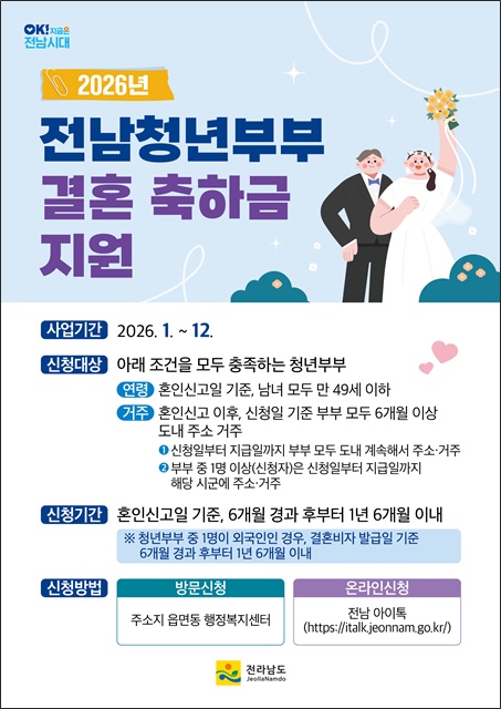 û³âºÎºÎ °áÈ¥ÃàÇÏ±Ý Áö¿ø»ç¾÷Àº Àü³²µµ°¡ 2021³â Àü±¹ ±¤¿ª½Ã¡¤µµ ÃÖÃÊ·Î ½ÃÇàÇß´Ù. Áö¿ø ´ë»óÀº È¥ÀνŰíÀÏ ÇöÀç 49¼¼ ÀÌÇÏ ºÎºÎ´Ù. ½ÅûÀÏ Á÷Àü±îÁö Àü³²¿¡ 6°³¿ù ÀÌ»ó ÁÖ¼Ò¸¦ µÖ¾ß ÇÑ´Ù. È¥ÀνŰí ÈÄ 6°³¿ùÀÌ Áö³ ³¯ºÎÅÍ 1³â 6°³¿ù À̳» ½Åû °¡´ÉÇϸç, ½ÅûÇÑ ´ÞÀÇ ´ÙÀ½ ´Þ 15ÀÏ¿¡ ¹ÞÀ» ¼ö ÀÖ´Ù.